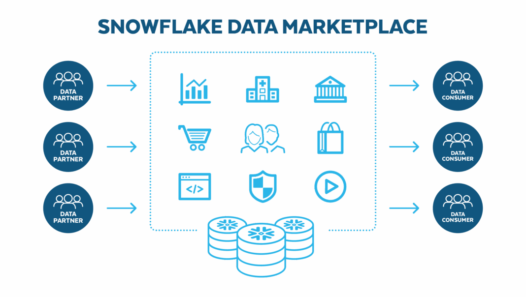 - Snowflake Data Marketplace, AWS Data Exchange, Azure Data Share, Google Cloud Analytics Hub